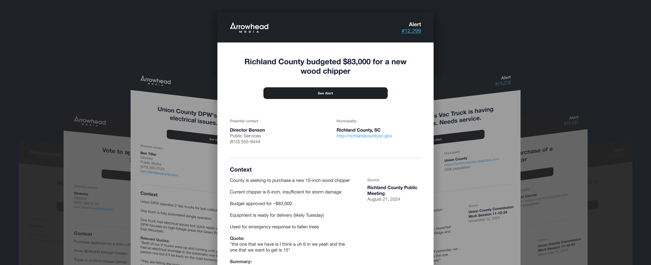 We scan tens of thousands of meetings to detect when someone wants to buy or rent your product. By combining a powerful, custom-built database with a massive firehose of meetings, we can determine when a government wants to buy and who the salesperson should call.